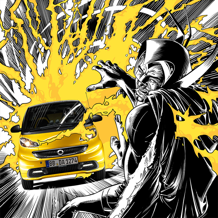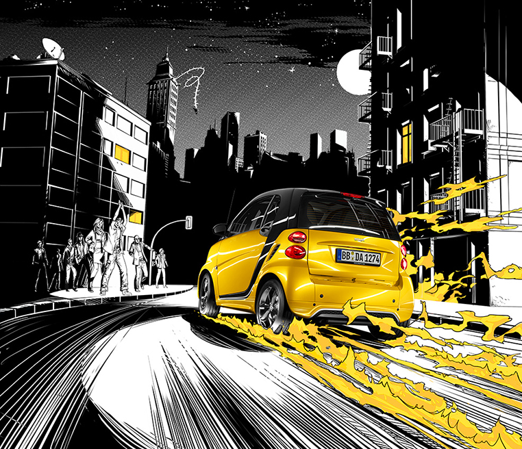 Für die aktuelle Kampagne zum smart Sondermodel fortwo cityflame textete und illustrierte Rainer Laws nach einer Story der Kreativabteilung von BBDO Berlin einen aufwändigen Comic-Prospekt. Die stilistische Vorgabe kann man mit „Film Noir meets Superhero“ beschreiben.